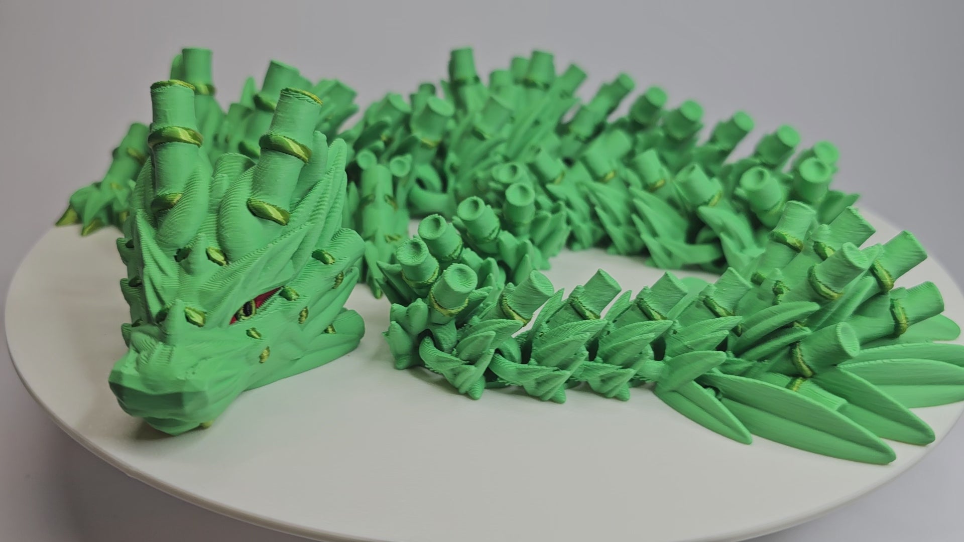 Bambus Drache aus 3D-Druck mit beweglichen Gelenken. Dekoratives Objekt in Bambusgrün mit gelben Akzenten, 72 cm lang, aus PLA gefertigt, hergestellt in Österreich.